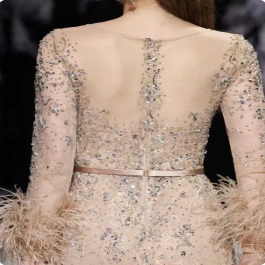 Transparência Delicada: As mangas e a parte superior do busto mantêm a transparência do tule, contrastando com o forro opaco em tom nude/bege, que dá a impressão de que os cristais estão flutuando sobre a pele.
